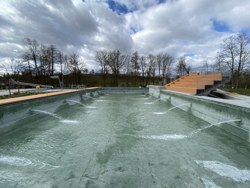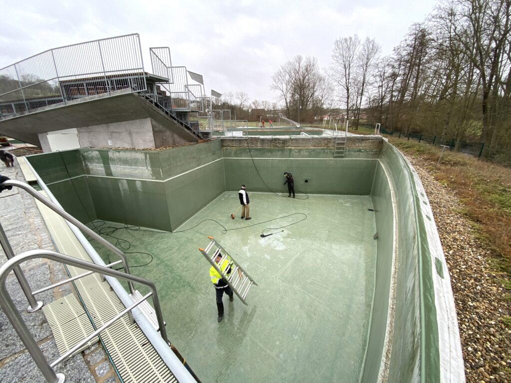 Anfang März, wenn das erste Grün zu sprießen beginnt, geht es los. Das Wasser aus der vergangenen Badesaison befindet sich über Winter in den Becken, damit das hochdrückende Grundwasser und der Frost keinen Schaden anrichten können. Die Eispuffer, die den Beckenrand vor dem Auffrieren schützen, werden entfernt und für den Herbst eingelagert.